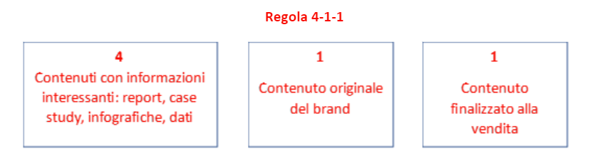 Una possibile strada da seguire è quella della regola 4-1-1 che consiste nel realizzare contenuti che diano ai lettori informazioni interessanti, come dati, report, case study o infografiche, alternandoli a un contenuto del tutto originale del brand e a uno promozionale, con l’obiettivo di generare vendite.